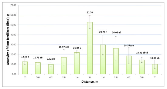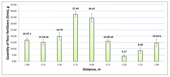 The results of the uniformity of the application of flour fertilizer (lime) are shown in Figure 6 and Figure 7. Experimental studies of the uniformity of the application of dry lime flour fertilizer (Figure 6) showed that the least amount of flour fertilizer (lime) entered the boxes furthest from the spreading discs of the fertilizer machine. Meanwhile, the box in the center of the spreader had the highest amount of fertilizer. It is important that, during the study, these boxes were placed in the center, between the tractor and the fertilizer wheels. The most reliable results of the one-way ANOVA statistical evaluation of the distribution of dry flour lime fertilizer between the boxes were from the center of the manure spreader (distance 0.00 m), while the results were less reliable at the edges of the spreading area. The amount of fertilizer in the central box was 4.2–5.2 times higher than in the boxes 7 m from the center of the spreader. In order to assess the uniformity of this distribution, g2 = 1.99 (p < 0.05) was calculated. It can be indicated that the uniformity is lower compared to the uniformity of the application of cattle manure organic fertilizer granules.