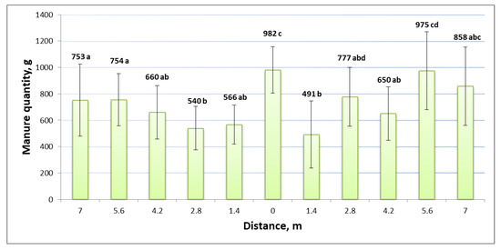 Uniformity of manure distribution. Mean data followed by a similar letter(s) are not statistically significant within each other; p < 0.05.