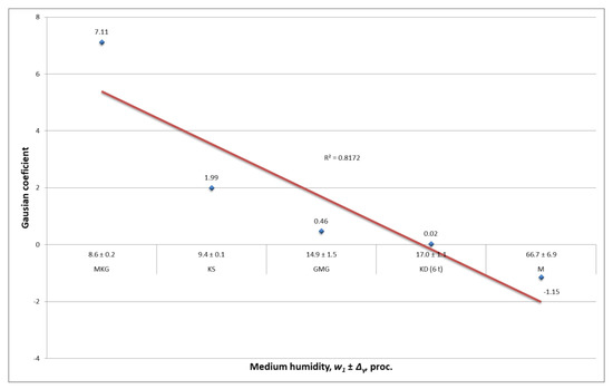 Experimental studies have shown that as the average moisture content of the fertilizer increases, the Gaussian coefficient decreases and approaches zero, which suggests that the uniformity of fertilizer application increases (Figure 9). Moisture can significantly affect the results of the uniformity distribution due to its significant influence on the interactions between the plasticizer and enhanced granules [37]. The dependence was evaluated by calculating the coefficient of determination R2 = 0.817, which indicates that there is a sufficiently high relationship between the average moisture content of organic fertilizers and the spread of fertilizers on the soil surface.