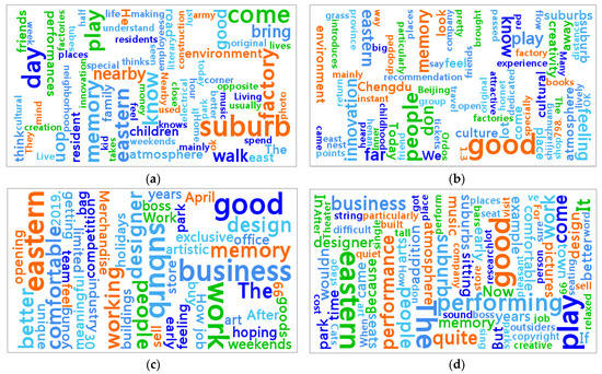 Word cloud of stakeholders’ subjective feelings: (a) the tourists; (b) the residents; (c) the staffs; and (d) the theatre audiences.