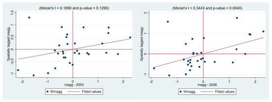 This paper uses Moran scatterplots to further verify the spatial correlation between residents’ consumption and manufacturing industrial agglomeration. Figure 2 and Figure 3 present the Moran scatterplots of residents’ consumption and industrial agglomeration for 31 Chinese provinces in 2003, 2008, 2014, and 2019. The sample value of 31 provinces is not randomly distributed in four quadrants, but rather in a regular gathering distribution. Regarding the distribution of Moran scatterplots of residents’ consumption, there are 21 provinces located in the first and third quadrants in 2008 and 2014, 22 in 2019, and 23 in 2003, where people’s consumption is high and the surrounding provinces’ consumption is also high, such as in Beijing, Tianjin, and Shanghai, and those provinces with lower consumption have neighboring provinces with lower consumption, such as Guizhou, Gansu, and Xinjiang. In addition, provinces in the first and third quadrants account for about 70% of all provinces in these four years. For the independent variable of industrial agglomeration, the numbers of scattered points from 2003 to 2019 located in the first and third quadrants are 18, 21, 23, and 22 respectively. However, more scattered points in 2003 and 2008 tend towards 0, and the Moran’s I values of industrial agglomeration in recent years are relatively low. Thus, Figure 2 again confirms that significant spatial autocorrelation of residents’ consumption exists.