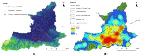 The POI of rural tourism (a) and the kernel density analysis of tourism points in GIS (b).