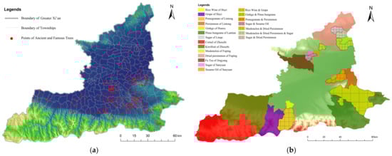 The points of ancient and famous trees (a) and the distribution of the geographical indication products (b).
