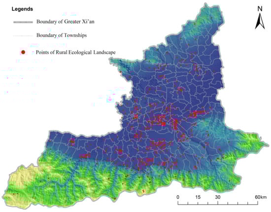 Rural ecological landscape is composed of various unique places which are an important embodiment of rural tangible culture and “rurality” such as settlement landscape, architectural landscape, and human relics. This type of cultural landscape contains more specific content. Furthermore, the POI (points of interest) from the ‘Web Service API’ interface of Baidu Map Open Platform (http://lbsyun.baidu.com/, accessed on 30 November 2019) and Dianping web data can be obtained according to the classification of the previous article. After filtering out duplicate, redundant, invalid, spatial mismatch, and other data, 2440 pieces of original data diminished to a total of 702 valid data points, and their specific distribution is shown in Figure 4.