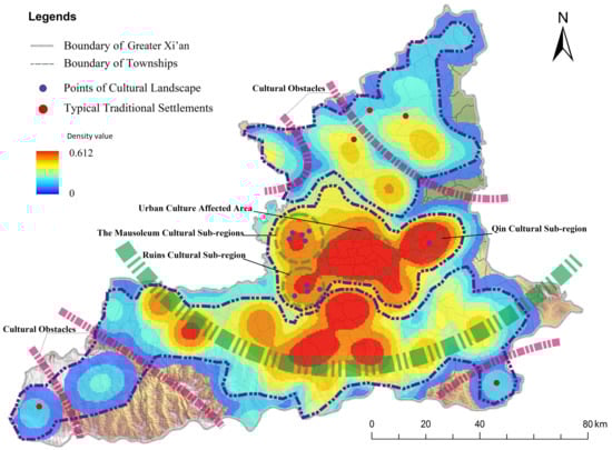 We used the GIS platform to analyze the data points by kernel density analysis. Setting the pixel size to 450 m and the bandwidth to 10 km to realize the spatial expression of the rural ecological landscape of greater Xi’an and to explore its regional spatial characteristics. The rural ecological landscape in the greater Xi’an area has three types of landscape culture areas with strong specialization from north to south: sites and relics culture areas on the northern Wei River; Zhou, Qin, Han, and Tang dynasties culture areas; and the religious and traditional settlement culture areas in the northern Qinling Mountains.