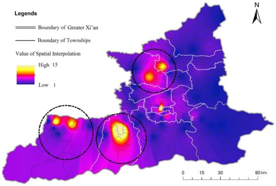 Except for the high-value aggregation present in completely urbanized areas, it was easily found that there are four high-value aggregation areas, and the space characteristics of farmer creative landscape in greater Xi’an can be expressed through the picture shown above.