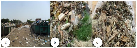 Types of municipal waste sampled in pre-collection centers: (a) waste bin; (b) unsorted waste; (c) sorted and dried waste.