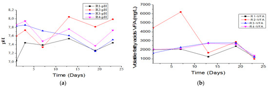 Evolution of pH (a) and VFA (b) during anaerobic digestion: R1: 10% BD + 90% PS at 30 °C; R2: 10% BD + 90% PS at 45 °C; R3: 30% BD + 70% PS at 30 °C; R4: 30% BD + 70% PS at 45 °C.
