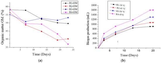 The organic matter decreases during the process of anaerobic digestion, in all of the reactors (Figure 5a). Organic matter reductions of 8.51%, 16.85%, 4.32% and 21.57% were obtained, respectively, in reactors R1, R2, R3 and R4. During anaerobic digestion, organic matter was transformed into volatile fatty acids, used by methanogens bacteria for biogas production [43,44,45]. Laskri et al. [46] showed that the degradation of organic matter is more readable with a COD decrease during biogas production from sludge. In their experience, biogas volume formed was correlated with the organic load degradation of sludge. Studies showed this reduction is more accentuated in reactors R2 and R4, operated at a temperature of 45 °C. The effect of temperature on hydrolysis has been studied by several authors, between 20 and 70 °C [47,48]. According to Amodeo et al. [47], thermophilic (55 °C) was the best condition for the hydrolytic stage. The effects of operating conditions (temperature and substrate mixture) on biogas production are presented in Table 3. For both substrate mixtures, the increase in operating temperature, from 30 to 45 °C, significantly enhanced the biogas production. Indeed, for the same substrate mixture, the biogas generated at 45 °C (R3 and R4) was significantly higher than that generated at 30 °C (R1 and R2) (p < 0.0001). These results are in concordance with Ross et al. [49], who reported increased activity in methane-producing bacteria with temperature increases. However, it has been shown that the biogas yield was not influenced by temperature in the range of 40–55 °C when the ammonia concentration was moderate [50].