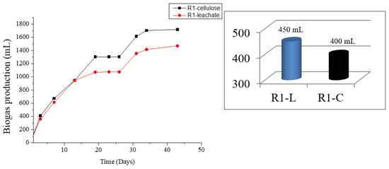 The biogas production with activated sludge reactors, supplemented with leachate (R1-L) and cellulose (R2-C), respectively, increased after day 25 days (Figure 6). This shows the depletion of the initial substrate used, marking the end of the methanization process. Biogas production resumes with the addition of cellulose and leachate, respectively, in R1-L and R2-C. Quantities of 450 and 400 mL were obtained, at 16 days digestion of cellulose 5% (m/v) and leachate, respectively. Studies have shown that cellulose is a good substrate for anaerobic digestion, with methane yields ranging from 340 to 366 L (CH4)·Kg−1 SV [56]. Raposo et al. [57] used cellulose as a reference substrate with theoretical methane production of 373 mL (CH4)·g−1 SV, or 90% of maximum production if 100% was converted into biogas. There is no significant difference between biogas production with cellulose and leachate from the organic fraction of municipal waste fermentation (p = 0.155). Cellulose is a substrate with a simple structure that can maintain the microbial flora of anaerobic digestion. Matejka [29] showed leachate from municipal solid waste was composed of dissolved organic matter, major mineral compounds (Ca2+, Mg2+, K+, Na+, NH4+, Fe2+, etc.) and traces of heavy metals (Cd, Zn, Ni, Pb, etc.). Leachate from the organic fraction of municipal waste fermentation could be used for the maintenance of microbial flora to boost anaerobic digestion.
