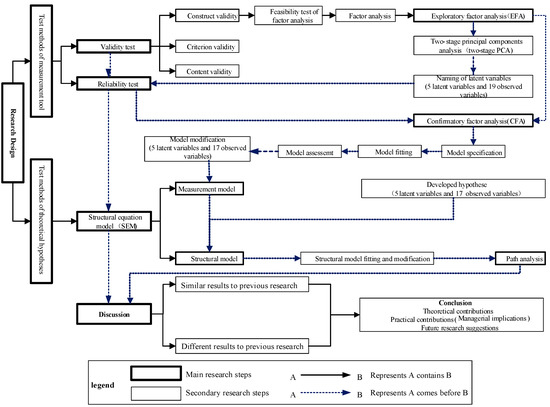This paper adopts SEM to validate the theoretical hypotheses, including the measurement model and the structural model. SEM analyzes the hypothesized relationship between latent variables and their observed variables with the measurement model, and it links the independent and dependent latent variables with a structural model [25]. The latent variables are renamed after the EFA and before the CFA, while the hypotheses are added after the establishment of the measurement model and before the establishment of the structural model. Both the measurement and the structural model are established and modified several times according to the fit indices to obtain the best fitting model. The path analysis in the best SEM model is used to test the statistical significance of the effect of the explanatory variables on the independent variables. Next, the paper conducts the comparative analysis between the hypothesis-testing results and the results of previous research, obtaining several managerial implications. Using such a comparative approach, this paper can best showcase the theoretical contributions and shed light on further research.
