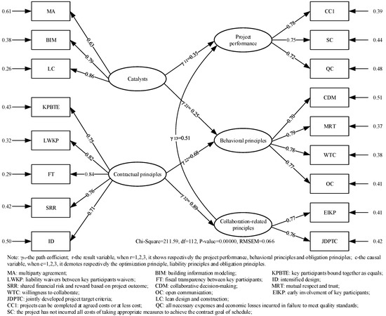 Referring to the classifications from NASFA et al. [26] and AIA [36], the latent variables in this study were slightly modified based on the results of the two-stage PCA, considering the applicability and feasibility of these principles in China. Hence, the five latent variables were renamed project performance, contractual principles, collaboration-related principles, behavioral principles, and catalysts. The contractual principles may be written into agreements. The behavioral principles are necessary for project optimization, but are ultimately choice-based. The catalysts can be greatly beneficial for optimizing project results. The collaboration-related principles can be implemented, to a large extent, if all parties agree to collaborate. Compared with the categories from NASFA et al. [26] and AIA [36], some contractual elements are subdivided into collaboration-related principles. Collaborative decision making is added to the behavioral principles.