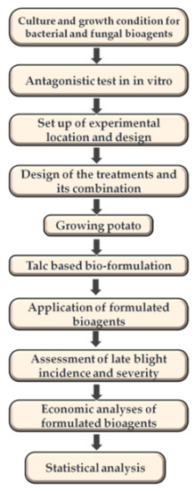 The cultures of bacterial bioagents were maintained in Luria−Bartani (LB) medium [58] and fungal bioagents were maintained in potato dextrose agar (PDA) medium. Two bacterial isolates viz. P. putida (BDISO64RanP) and B. subtilis (BDISO36ThaR) were isolated from potato phylloplane and rhizosphere identified previously by sequencing 16SrDNA [59] and were grown on the LB agar medium during the experimental period. Two fungal strains viz. T. paraviridicens (BDISOF67R) and T. erinaceum (BDISOF91R) (Islam et al., unpublished data) isolated from the rice rhizosphere were identified with ITS primer and were cultured on the PDA medium.