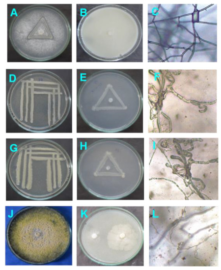 Growth inhibition of P. infestans by bioagents with the control. (A) Negative control, (B) positive control (Curzate M8), (C) mycelia of P. infestans, (D) pure culture of P. putida, (E) growth inhibition of P. infestans by P. putida, (F) deformation of mycelial structure of P. infestans by P. putidaunder stereo binocular microscope, (G) pure culture of B. subtilis, (H) growth inhibition of P. infestans by B. subtulis, (I) deformation of mycelial structure of P. infestans by Bacillus subtilis under stereo binocular microscope, (J) pure culture of T. erinacium, (K) growth inhibition of P. infestans by T. erinacium, and (L) deformation of mycelial structure of P. infestans by T. erinacium under stereo binocular microscope.