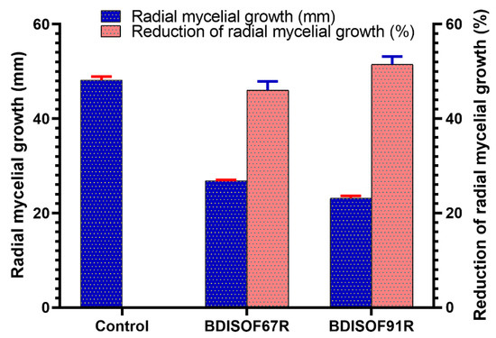 In vitro growth inhibition (mm) and percent reduction of mycelia growth of P. infestans by two antagonistic fungal isolates (BDISOF67R and BDISOF91R).