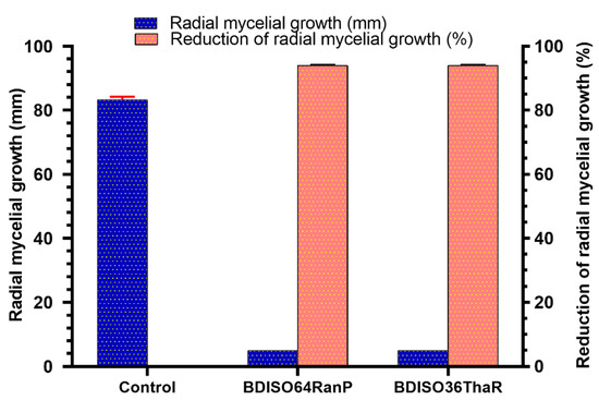 For fungal bioagents, a dual culture method was used to analyze whether T. paraviridescens/T. erinaceum inhibits the growth of P. infestans [60]. Trichoderma isolates were maintained in PDA strains at 4–8 °C for a short period of time. Briefly, a 5 mm diameter mycelial plug of P. infestans (9 days old) was placed on one side of a petri dish (9 cm diameter) containing pea agar and was pre-incubated at 18 °C for 2 days to initiate growth. Later, a 5 mm diameter disc of T. paraviridescens/T. erinaceum (7 days old) was placed 6 cm away from the pathogen on the dual plates, whereas a sterile PDA disc was placed in the control plates. The assay was done twice with five replications and the radial growth of the pathogen was measured 4 days after incubation at 18 °C. The percent radial mycelial growth inhibition (I) was calculated as follows [59]: