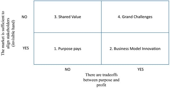 In order to cover the literature gap regarding the challenges to purpose, we are going to analyse the intersection of two dimensions. The first makes reference to the relationship that exists between purpose and profit. In a society that, as a whole, is moving towards the values of sustainability, the argument that it is possible to be both sustainable and profitable at the same time is clearly attractive. We also know that there is a long way to go in companies to improve their sustainability ratios without jeopardising, or even increasing, their profit levels, and we still must cover this distance. Yet, we also know that there are not always easy actions, and that we quickly move on to compromises (“trade-offs”) between profitability, inclusion, and environment []. Will companies and their management be prepared to sacrifice profit for other social and environmental profits? The answer is surely no, at least if we do not do anything more.