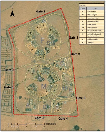 Najran University is the largest university in Saudi Arabia; it is a public university situated on 18 km2, and it is gender-segregated with two major campuses [73]. The university also contains many facilities (e.g., administrative buildings, support deanships, a university hospital, sports and entertainment centers, public school buildings, and housing for students and faculty members), as shown in Figure 1 [73]. The university population is growing fast, currently consisting of around 12,204 students (4860 males, 7344 females). There are 1365 faculty members (900 males, 465 females) and 661 staff (489 males, 172 females) [73]. All of these are full-time members; the staff work hours and students’ classes are mostly between 8:00 a.m. to 2:15 p.m., so the rush hours are from 7:30 to 8:30 a.m. and from 1:30 p.m. to 3:00 p.m. The number of university students are expected to increase rapidly, which will require more staff and faculty members. As shown in Figure 1, the campus has eight gates; only two are in use, and the main transportation infrastructure is composed of main ring roads surrounding NU. There are two rings, one for the male campus and the other for the female campus, as shown in Figure 1.