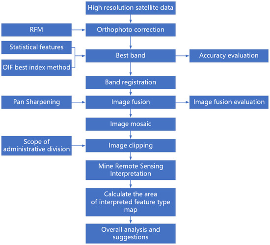 This paper adopted high resolution satellite data and carried out geometric correction, data fusion, and other processing [25,26] supplemented by other data for computer automatic extraction or human–computer interactive interpretation to obtain special information. On this basis, we carried out a mine geological environment development trend analysis, comprehensive research, and an evaluation [27] (Figure 2).