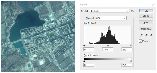 A histogram can intuitively display the distribution state of quality characteristics and can be clear about the shape, center position, and dispersion degree of data distribution. This paper adopted the synthesis of “red (R), green (G), and blue (B)”, adjusted the histogram of the image through the color scale tool, which can increase the contrast between the light and shade of the image, made it close to the natural color, and had richer layers and uniform tones. Therefore, it was more conducive to the identification and interpretation of mine information. The effect before and after stretching is shown in Figure 4.