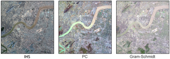 First, we used Pan sharpening of the original image by PCI GEOMATICA. Then, we realized three different fusion algorithms used, such as Intensity Hue-Saturation(IHS), PC principal component transform fusion (PC), and Gram-Schmidt Spectral Shaping (Gram-Schmidt) by ENVI5.3 (The Environment for Visualizing Images). The effects of three fusions are shown in Figure 5. From a macro perspective, image contrast was enhanced by IHS, but the color of the image is not true because a certain color distortion appeared. By comparison, PC and Gram-Schmidt had a better effect, which can make the figure clearer, and color fidelity is relatively higher (Figure 5).