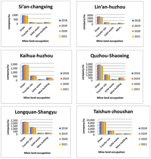 According to the statistics of the survey results, the mining area of each metallogenic belt was mainly stope. Among them, the stope area of the Taishun-Zhoushan metallogenic belt was the largest, which is 8489.32 ha, 8529.44 ha, 8310.81 ha, and 8072.33 ha, respectively, from 2018 to 2021. The stope area of the Si’an-Changxing metallogenic belt was the smallest, 901.99 ha, 888.09 ha, 858.50 ha, and 856.03 ha, respectively, from 2018 to 2021. The stopes of the Lin’an-Huzhou metallogenic belt, the Quzhou-Shaoxing metallogenic belt, and the Longquan-Shangyu metallogenic belt all covered an area of more than 2000 ha. The solid waste covered the least area, and the Quzhou-Shaoxing metallogenic belt, Longquan-Shangyu metallogenic belt, and Taishun-Zhoushan metallogenic belt covered an area of more than 100 ha. The area of solid waste in the Si’an-Changxing metallogenic belt was the smallest, unchanged from 2018 to 2021, all of which were 11.55 ha. The Taishun-Zhoushan metallogenic belt covered the largest area of the transfer site, with 2230.39 ha, 2265.15 ha, 2208.66 ha, and 2162.99 ha from 2018 to 2021, respectively. The second was the Longquan-Shangyu metallogenic belt, with 1174.70 ha, 1179.78 ha, 1126.28 ha, and 1101.81 ha from 2018 to 2021, respectively. The transfer sites of the other four metallogenic belts covered an area of less than 1000 ha. The Quzhou-Shaoxing metallogenic belt covered the largest area of mine buildings, with 381.77 ha, 381.75 ha, 380.90 ha, and 374.21 ha from 2018 to 2021, respectively (Figure 7).