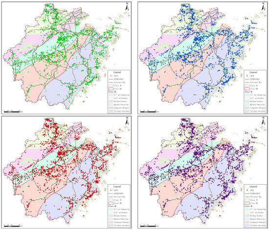 The figure shows the spatial distribution of the restoration and control of the metallogenic belt from 2018 to 2021. It can be seen from the figure that the spatial distribution of the restoration and control points is uneven, showing a trend of less in the south and more in the north. It is mainly distributed in the economically developed areas of the northern, central, and eastern plains of Zhejiang Province, and the mine covers less land in the economically underdeveloped areas in the south and southeast. In addition, another obvious feature is that it is distributed along rivers, expressways, national highways, and other important traffic trunk lines, indicating that in carrying out the restoration and treatment project, the natural resource departments and mining units have made great efforts to promote the restoration and treatment of mines and the improvement of ecological environments from the comprehensive treatment of key areas such as “three areas and two lines”, which has made positive achievements in the protection of the mine geological environments (Figure 8).