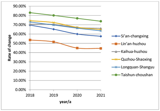 According to the above mathematical statistical model, the change degree of mine development land occupation in the metallogenic belt of Zhejiang Province from 2018 to 2021 is shown in the table (Table 4) (ha a−1 indicates the change of mine development land occupation).