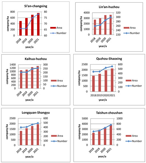 The Lin’an-Huzhou metallogenic belt ranked first in the area of restoration and control. The areas of restoration and control from 2018 to 2021 were 2730.96 ha, 2977.79 ha, 3551.48 ha, and 3610.72 ha, respectively (Figure 10). Hangzhou and Huzhou are both economically developed areas in Zhejiang Province and have played a leading role in the implementation of sustainable development strategies such as mine restoration and management. As the birthplace of the concept of “two mountains”, Huzhou has continued to strengthen mine management, improve the construction level of green mines, protect the natural ecology with beautiful mountains and rivers, and strive to be a model place to practice the concept of “two mountains”. It has also shown a good demonstration and promotion role for other regions. At present, the mine ecological construction in Huzhou has achieved remarkable results and is in the forefront of the country.