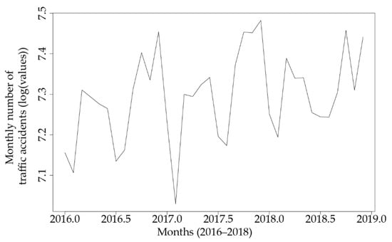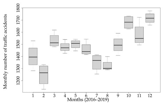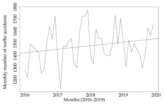 As in other studies [62,63,64], the number of traffic accidents was considered on a monthly basis. The study of spatio-temporal correlation of traffic accidents is addressed in papers [63,64] that are not included in our paper and represent one of the directions for further research. The main difference with the work studied is that this work clearly indicates that most traffic accidents occur in the last quarter of the year. If the spatio-temporal correlation was undertaken on the basis of individual zones and different years, then we would see the results of the work on road safety prevention. This paper presents an analysis of the time series that gave a clear picture of the existence of a pattern in the number of road accidents on a monthly basis for the period 2016–2019.