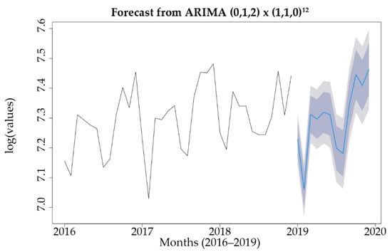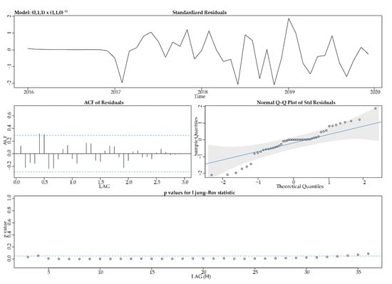 When all the data (2016–2019) were used to build the model, applying the auto.arima function resulted in the following model SARIMA(0,1,1) × (1,1,0)12. The results of the residual analysis are shown in Figure 9. Almost all spikes are now within the significance limits in the ACF diagram.