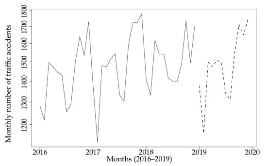 Data on the number of traffic accidents by month from 2016 to 2018 (36 months) were used to build the model, while data on the number of traffic accidents by month from 2019 (12 months) were used to test the accuracy of the model.