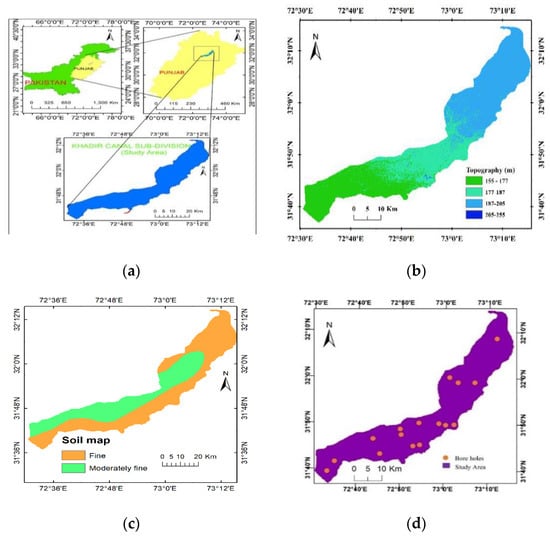 Figure 1. Characteristics maps of the study: (a) study area location map (canal subdivision of Khadir, the Chaj doab, Pakistan); (b) topographic map; (c) soil texture map; and (d) map of sampling boreholes.