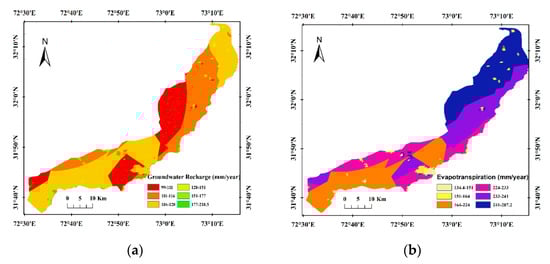 Figure 4. Long-term calculated groundwater recharge and evaporation distribution maps: (a) long-term simulated recharge of groundwater; and (b) evapotranspiration.