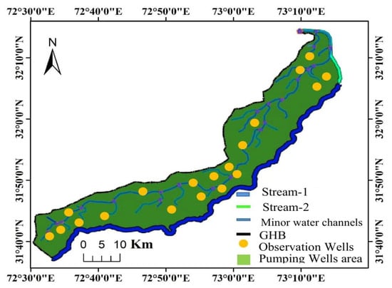 Figure 5. Boundary conditions of the study area to show rivers (Stream-1 and Stream-2), minor water channels, and observation wells.