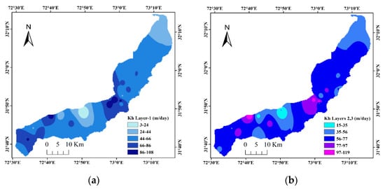The hydraulic properties were defined on the basis of the available bore log data. These included the horizontal and vertical hydraulic conductivities, as well as the aquifer storage properties. The hydraulic conductivity that was given to the model varied between 1 and 119 m/day as the maximum and minimum values, respectively, with an average value of 66 m/day. A similar hydraulic conductivity range within the province of the Punjab realm was used by the authors of [44,45,46]. Only 5% of Layer-1 had a horizontal hydraulic conductivity (HHC) value in the range of 1–30 m/day, 80% had an HHC value in the range of 30–80 m/day, and the remaining 15% had an HHC value in the range of 80–108 m/day, as is shown in (Figure 6a). From the spatial distributions of the HHCs for Layer-2 and Layer-3, it was found that only 3% of Layer-2 and Layer-3 had an HHC value in the range of 1–30 m/day, 80% had an HHC value in the range of 30–80 m/day, and 17% had an HHC value in the range of 80–119 m/day, as is shown in (Figure 6b).
