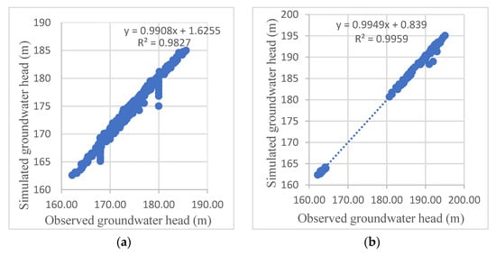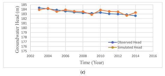 Data from 2003 to 2007 were utilized for the warm-up period of the transient model, while data from 2008 to 2014 were used for the model calibration. The transient model outcomes are depicted in Figure 8a, compared to a time series of the observation well heads. This hydrograph depicts the mean values of the observed and simulated water table heads for a transient-stage model (Figure 8c). For the calibration of the groundwater head, 19 observation wells were used over a period of 12 years to record the groundwater levels. The value of R2 was found to be 0.99, and it is a significant fit between the simulated and observed heads. Calibrated groundwater model parameters are shown in Table 1. The mean errors ranged from 0.10 to 0.32 m, and the root mean square error was 0.0027 min total. Table 2 shows the statistical analysis. Data from 2015 to 2019 were used for the model validation, as is shown in (Figure 8b).