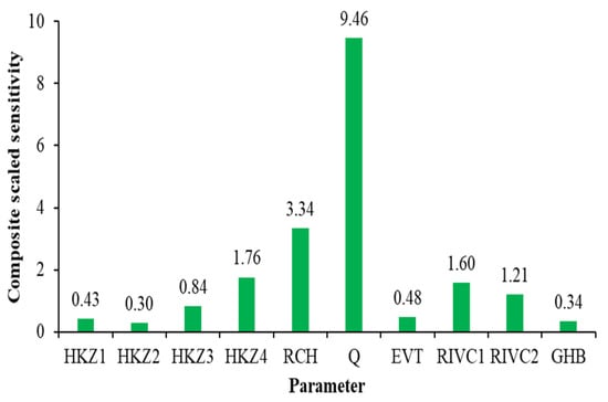 A sensitivity analysis was performed by using the computer program known as UCODE (universal sensitivity analysis, calibration, and uncertainty evaluation) [47], and by using ModelMate [48]. The program was used for studying the sensitivity of the hydraulic conductivity (HKZ), the groundwater recharge (RCH), the discharge (Q), the evapotranspiration (EVT), the general head boundary (GHB), and the river conductance (RIVC). The parameters of the discharge (Q), the recharge (RCH), and the hydraulic conductivity (HKZ4) were found to be more sensitive, and the parameters of the hydraulic conductivity (HKZ2) and the general head boundary represent the least sensitive parameters. Moreover, the pumping rate (Q) and the groundwater recharge were found to be highly sensitive groundwater model parameters, as is shown in (Figure 9).