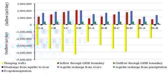 The results of Scenario I-A show that there was a 5.0 m decrease in the groundwater table in 2020 from the reference point of the calibrated steady-state model (2000–2019), with a pumping rate of 2,915,029 m3/day. In the 1-B scenario, the model predicted that the groundwater table would decrease by up to 9.8 m in the year 2025, which is due to the pumping rate of 3,441,109 m3/day from the level. For Scenario I-C, the groundwater was predicted to decline by 14.6 m from the reference because of the increase in the pumping rate to 3,904,630 m3/day in 2030, and Scenario I-D simulated a decrease of 18.1 m in the year 2035, and the pumping rate was predicted to be 4,262,693 m3/day in 2035, as is shown in Table 4. The simulated results of Scenario II-A show that, by increasing the discharge from pumping by 25%, the groundwater table would decrease by up to 2.0 m by the end of 2029, from the reference. The Scenario II-B results show a decrease of 5.5 m at 50% increased pumping. The Scenario II-C results show a decrease of 9.8 m at 75% increased pumping, and the Scenario II-D results show a decrease of 14.3 m at 100% increased pumping in the year 2029, from the reference. The Scenario III-A results predicted that, by decreasing the recharge from the river and other water bodies by 50%, because of uncertain climate change, drought, etc., the aquifer recharge from the river was 1,069,024 m3/day instead of 2,134,048 m3/day in 2019, which caused a 2.4 m decrease in the water table from the reference. The Scenario III-B results predicted that, by decreasing the recharge from the rainfall by 50%, because of uncertain climate change, drought, etc., the aquifer recharge from the rainfall was 182,482 m3/day instead of 364,890 m3/day in 2019, which caused a 0.7 m decrease in the water table from the reference. A graphical representation of the recharge to, and the discharge from, the aquifer under different scenarios is shown in (Figure 10).