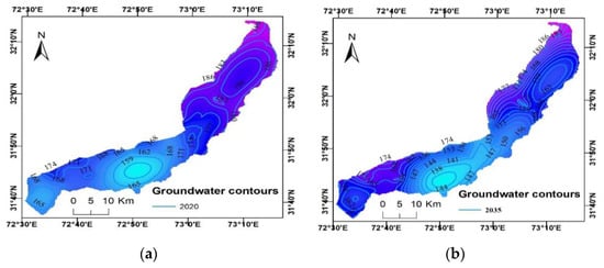 Because of the imbalance between the groundwater abstraction and the recharge at different locations, many mixed drawdown levels were seen at every observation well. It was simulated that, at most of the locations, there was lowering in the water table, and at only very few observation wells, there was lowering in the groundwater level. The model predicted that the groundwater level in the vicinity of the monitoring in Pir Panja, and towards the riverside of the Khadir distributary, would be little affected by the discharge until 2035. Similarly predicted results show that the groundwater levels in the observation wells in the vicinity of Vijhalke Minor, Kalri Minor, and Walla Minor were decreasing less than the observation wells that were installed near Khadir Minor. For Scenario-I, the contour intervals of the groundwater table were kept constant for each year. The ranges of the minimum and maximum contour lines of the groundwater table varied from 159 to 189 m, and from 138 to 186 m, for the years 2020 and 2035, respectively, as is shown in Figure 11a,b, respectively.