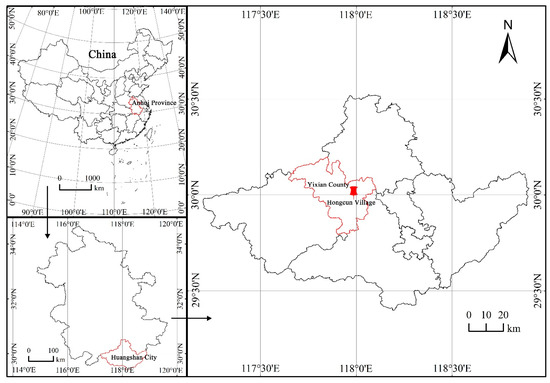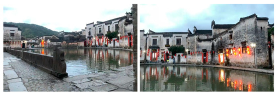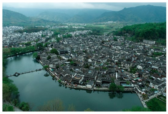Hongcun is located in the northeast of Yixian County, southwest of Huangshan City in the south of Anhui Province (Figure 1), which was also historically named Huizhou. Hongcun was built in 1131 CE during the Shaoxing period of the Southern Song Dynasty and has a history encompassing more than 890 years [58]. In terms of natural resources, the village is mostly located in the flat zone of the Hongcun basin and has a humid subtropical monsoon climate. In terms of historical and cultural resources, there are 103 traditional buildings originally built in the Ming (1368–1644 CE) and Qing (1644–1911 CE) dynasties, along with 34 buildings built during the Republic of China (1912–1949 CE) [59], some of which were built for the purpose of glorifying and illuminating their ancestors by Huizhou merchants who had accumulated much wealth when away from home. The overall architectural layout and settlement form, and the specific interiors of individual buildings in the village, were guided by the geomantic omen theory of Zhouyi, which embodies the traditional Chinese philosophy of the unity between humans and nature. In 2000, as a “witness of traditional human civilization, a typical work of local traditional architecture, and a brilliant model of the harmonious combination of human and nature”, Hongcun village was listed as a World Cultural Heritage Site. Since then, it has won the great honor of being listed by the National Key Cultural Relics Protection Unit (2001), the First Group of Chinese Historical and Cultural Villages (2003), and the National 5A-level Tourist Scenic Spots (2011).