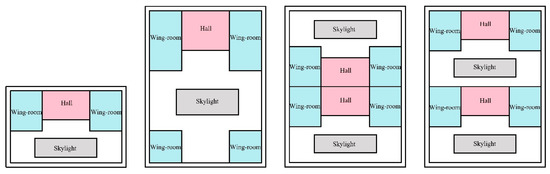 Traditional vernacular houses are the physical shelters produced by people’s instinctive need to keep themselves away from the wind and rain. Due to the characteristics of narrow spaces and a large population, the vernacular houses in Hongcun are used and divided rationally into limited spaces. Therefore, making full use of limited space is a major feature of the residential space environment. The typical single-story vernacular houses can be renovated for living needs by the lengthwise expansion of the functional space and by increasing the number of floors. The Sanheyuan courtyard is the basic type of house layout, with three variations including the docking of two triad courtyards (“回” type), the opposite connection of two triad courtyards (“H” type), and the series connection of two triad courtyards (“日” type) (Figure 4). Of these four types of houses, there are 42 houses of the Sanheyuan type, and 17 of the “回” type, 12 of the “H” type, and 8 of the “日” type. The above four forms are the main components of the residential houses of Hongcun. Among them, the Sanheyuan courtyard is the most distinctive component of the Hongcun vernacular architecture and is suitable for houses with a small homestead area. The Sanheyuan courtyards are generally two-story houses with a symmetrical layout. A three-bay room occupies the ground floor, and the principal room is in the middle, with bedrooms on both wings; a narrow and long patio with a very small depth is on the front of the hall, and both sides of the patio are generally porches, sometimes used for bedroom entrances. The layout of the second floor is basically similar to that of the ground floor. The principal room is the ancestral hall, displaying ancestral tablets. The two wing sides are used as bedrooms, storage rooms or corridors. The straight-running wooden ladder connects the upper and lower floors, either behind the wall or in the side corridors. Thus far, the Sanheyuan courtyard is still the prevailing form in both newly built houses and traditional vernacular houses.