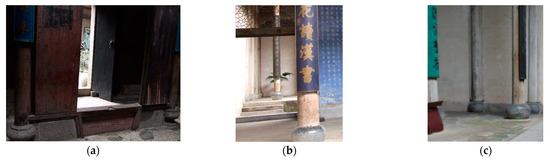 The organic combination of wood and stone. Source: the authors, 12 April 2021. Notes: The pillar foundations are the stones that bear the load of the roof columns, which can play a role in preventing moisture. (a) The wooden gate and the door pillow stone; (b) The fully exposed wooden pillars and stone pillar foundations; (c) The wooden pillars and stone pillar foundations in the wall.