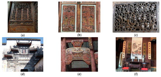 Examples of traditional houses and their interiors in Hongcun. Source: the authors, 12 April 2021. (a) Woodcuts on doors; (b) Color painting on doors; (c) Stone carvings on windows; (d) Arch gates; (e) Bend beam; (f) The common furnishings.