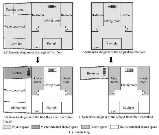 It can be seen from the above floor plans in Figure 7 that the owner of Songhetang (1) has built a new room as his bedroom and all the bedrooms in the original family home have been changed into rental rooms. At the same time, they make full use of the space in the corridor and have turned it into a restaurant. However, this homestay business has preserved the waterside pavilion, an important attraction in this vernacular house. The owner of Yuqingtang (2) keeps two rooms on the first floor as his family’s bedrooms, and the original six bedrooms and storage room have been changed into guest rooms. The owner of Gengxintang (3) has changed all the rooms in the house into bedrooms except for the living room and other public spaces. The owner has moved out of the main house and lives in a newly built house next door. In the three residential houses mentioned above, the owners make full use of various spaces for expansion and reconstruction in order to operate a homestay business, due to the limited space and lack of convenient living facilities. On the one hand, in order to better meet the living and aesthetic needs of tourists, they have all rebuilt the historical houses that they inherited from their ancestors but retained the original architectural style. On the other hand, while making use of their own vegetable plots and pig pens, they have purchased vacant farmland and houses on the verge of collapse from their neighbors and then converted them into guest rooms for greater economic benefit. Compared with the traditional houses, the overall architectural space of the reconstructed houses is greatly expanded, mainly expanding the first floor and public activity spaces. The residents not only change the function of the houses but also expand the living space of their families and improve their living conditions, thanks to tourism.