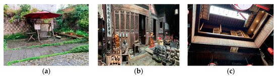 Secondly, the structure of the courtyards has been changed. The homestay operators also pay special attention to the courtyard space. Originally, the courtyard was mainly used for air-drying, storing unused goods, or carrying out family work. Now, the courtyards are decorated with plants and flowers, as well as sunscreen umbrellas, swings, and other leisure facilities to meet the needs of tourists. In addition, on the basis of these traditional courtyards, residents use the open spaces in the courtyards to build small shops and restaurants, using antique materials to expand the business space, which is much easier to see on the main tourist routes. The patios, which were originally open for ventilation and lighting, are now enclosed with glass to facilitate tourism reception (Figure 8). However, in order to maintain the rurality and uniqueness of the houses in a traditional style, the layout and furnishings of the halls are mostly kept intact.