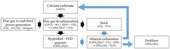Waste gypsum, among the industrial wastes, has a high calcium (Ca) content; therefore, it has good evaluation potential for CO2 capture. In the case of flue gas desulfurization (FGD) gypsum, the flue gas of the power plant can be used directly, and desulfurized gypsum, the starting material, can be continuously supplied. This eliminates the cost of CO2 capture, transportation, and raw materials. In addition, both calcium carbonate (CaCO3) and ammonium sulfate ((NH4)2SO4) generated after the reaction can be commercialized for use as CaCO3 for desulfurization and fertilizers (Figure 1). Phosphogypsum, generated by reacting sulfuric acid and phosphate rock to produce phosphoric acid [17], also has potential for MC. The annual production of FGD gypsum and phosphogypsum exceeds 140 million tons [18,19] and 280 million tons [20], respectively. If the total amounts of FGD gypsum and phosphogypsum were used to sequester CO2 through MC, almost 100 million tons of CO2 would be stored annually.