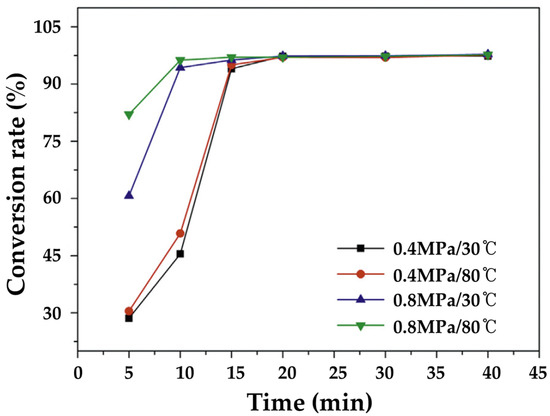 Furthermore, despite the different initial temperatures (30 °C, 80 °C), the carbonation conversion ratio was similar at 0.4 MPa, but when the pressure was increased to 0.8 MPa, a temperature difference appeared. Accordingly, the phosphogypsum carbonation reaction rate is more sensitive to temperature at high pressure (0.8 MPa) than at low pressure (0.4 MPa) [54].