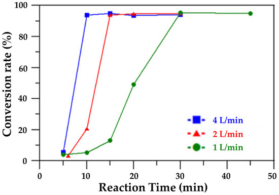 Theoretically, the total CO2 uptake should remain the same. However, at various CO2 flow rates, the calculated saturated CO2 uptakes at the inflection points of the curves were shown to be different. At a CO2 flow rate of 60 mL/min, the inflection point occurred at 20 min, when saturated CO2 sequestration had already been achieved. The total CO2 uptake, that is, the uptake capacity, can be attributed to the flow rate, inflection point time, and conversion rate. Therefore, carbonation efficiency increases with increasing flow rate and CO2 content [57]. Equilibrium was reached three times faster when the CO2 flow rate was 4 L/min than 1 L/min (Figure 3) [21]. When using 100 vol% CO2, more than 94% of the phosphogypsum was converted to calcium carbonate in approximately 30 min, whereas using 20 vol% CO2 required 90 min to achieve similar levels [61]. However, the CO2 sequestration efficiency did not always increase with the CO2 flow rate. The conversion increased slightly, but the time to reach reaction equilibrium became significantly shorter as the CO2 flow rate increased [62]. The optimal CO2 flow rate should therefore be selected based on CO2 storage efficiency, carbonation time, and product quality.