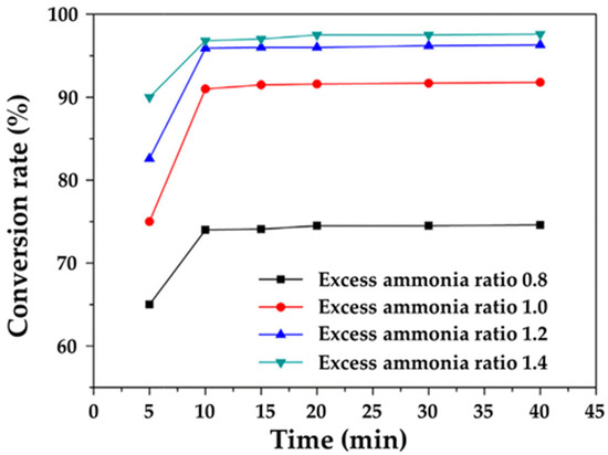 NH3 can increase the carbonation rate and produce ((NH4)2SO4) as a byproduct of the carbonation process. The conversion efficiencies with NH3 have been reported to be higher than 95% at 10 min [21,54]. The carbonation efficiency of FGD gypsum was shown to increase with increasing NH4OH concentration, and the carbonation reaction was almost completed within 10 min [21]. Although stoichiometrically the molar ratio of OH−/Ca2+ is 2, NH4OH must be replenished because NH4OH can be lost during carbonation at temperatures above 60 °C. High conversion efficiency can be obtained by reacting with a molar ratio of OH−/Ca2+ of 2.1–3.6, higher than the stoichiometric ratio [26,57]. However, the excess ammonia ratio does not control the reaction rate (Figure 4) [54]. The study showed that at a very low NH3 content, the reaction equilibrium was reached within 10 min, but the FGD gypsum conversion was only 43% [57]. The FGD gypsum conversion rate rapidly improved with increasing NH3 content. In addition, it has been reported that an increase in the CO2 partial pressure and NH3 content is more favorable for carbonate ion formation through thermodynamic modeling of an electrolyte non-random two-liquid (NRTL) model of the NH3-CO2-H2O system [63].